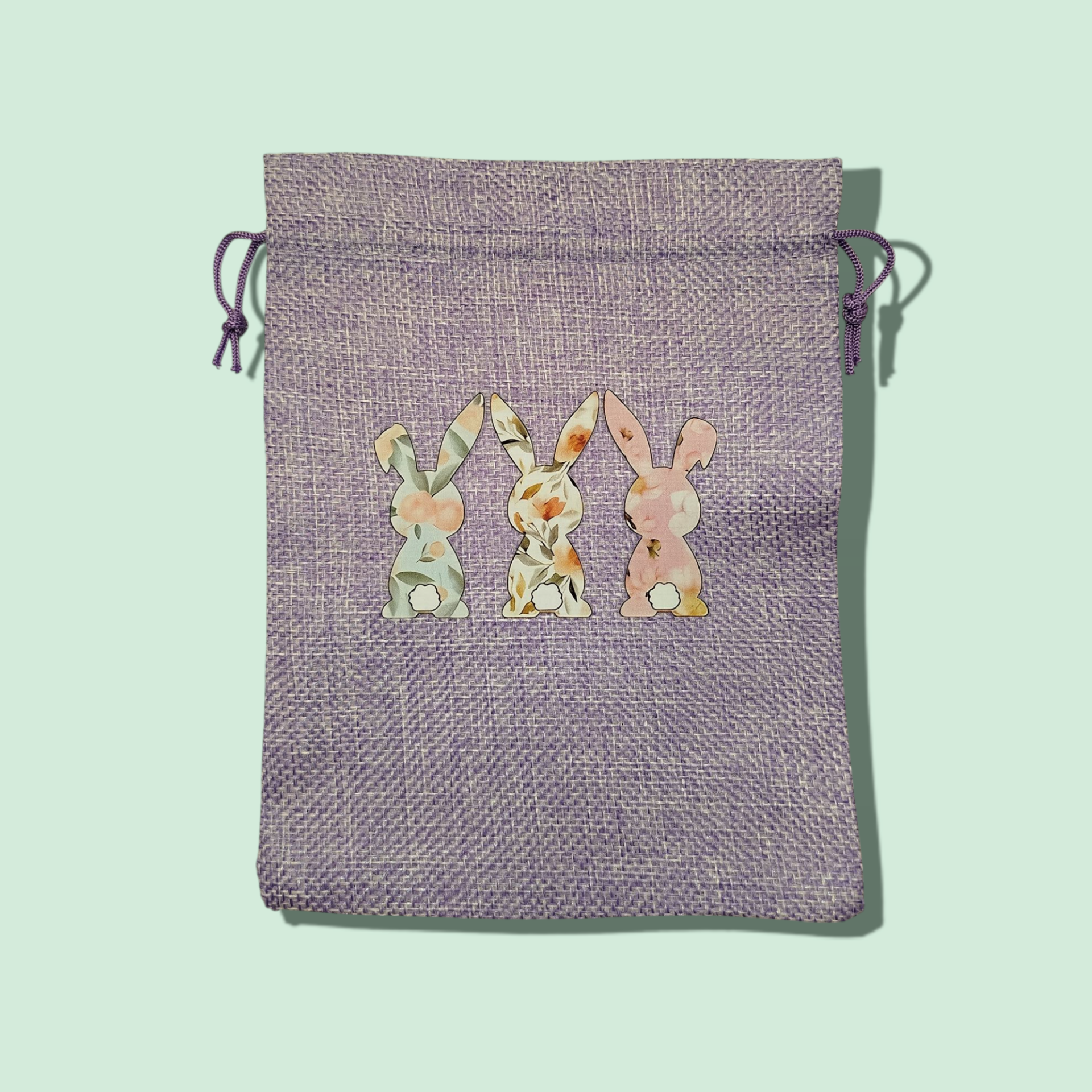 Süßer Jutesack in 6 verschiedenen Pastellfarben mit Ostermotiv und Wunschnamen (max. 10 Buchstaben)