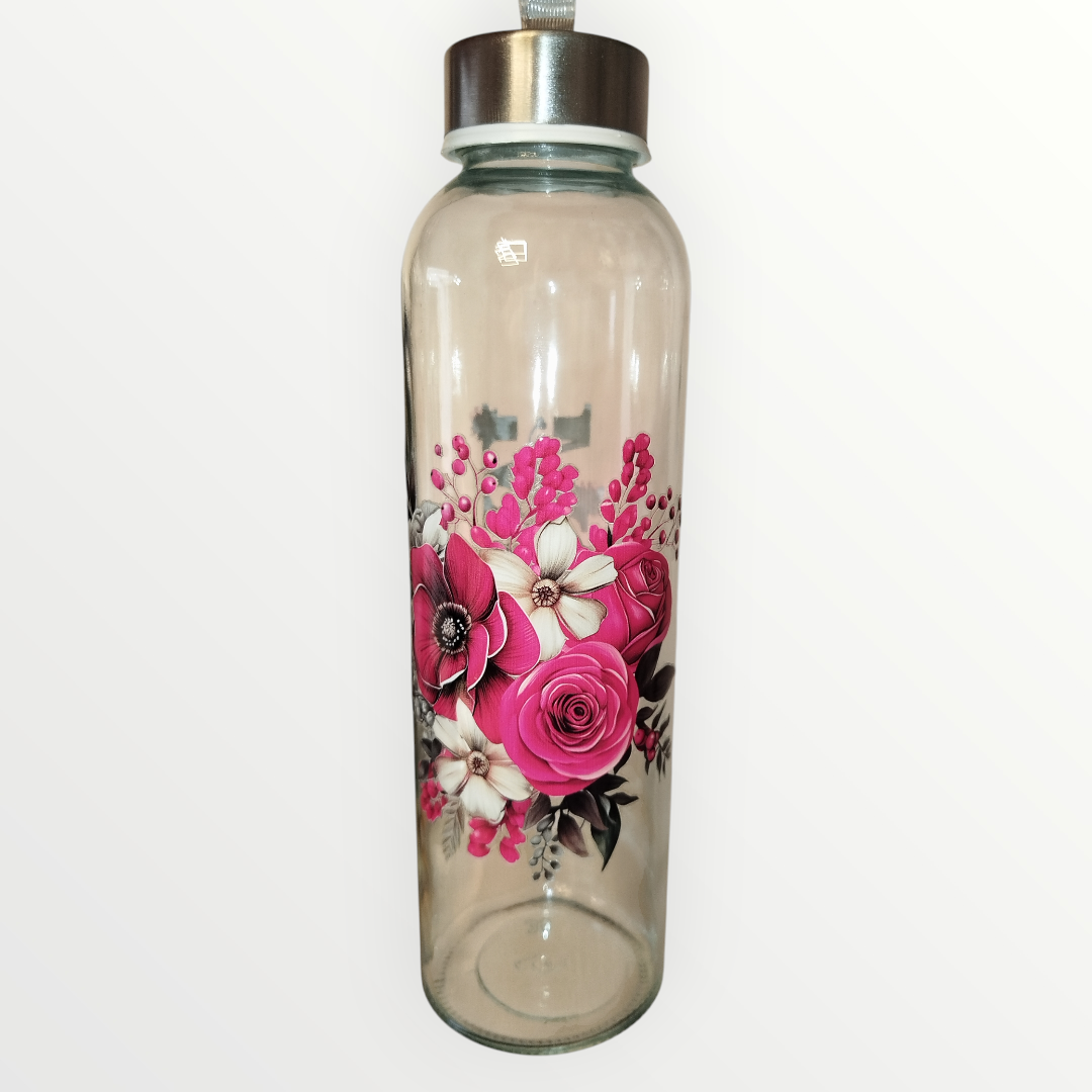 Trinkflasche aus Glas mit isolierender Neopren Hülle. Diese schützt die Flasche vor Brüchen und hält Getränke länger kühl oder warm. Eine stilvolle und praktische Wahl für unterwegs.