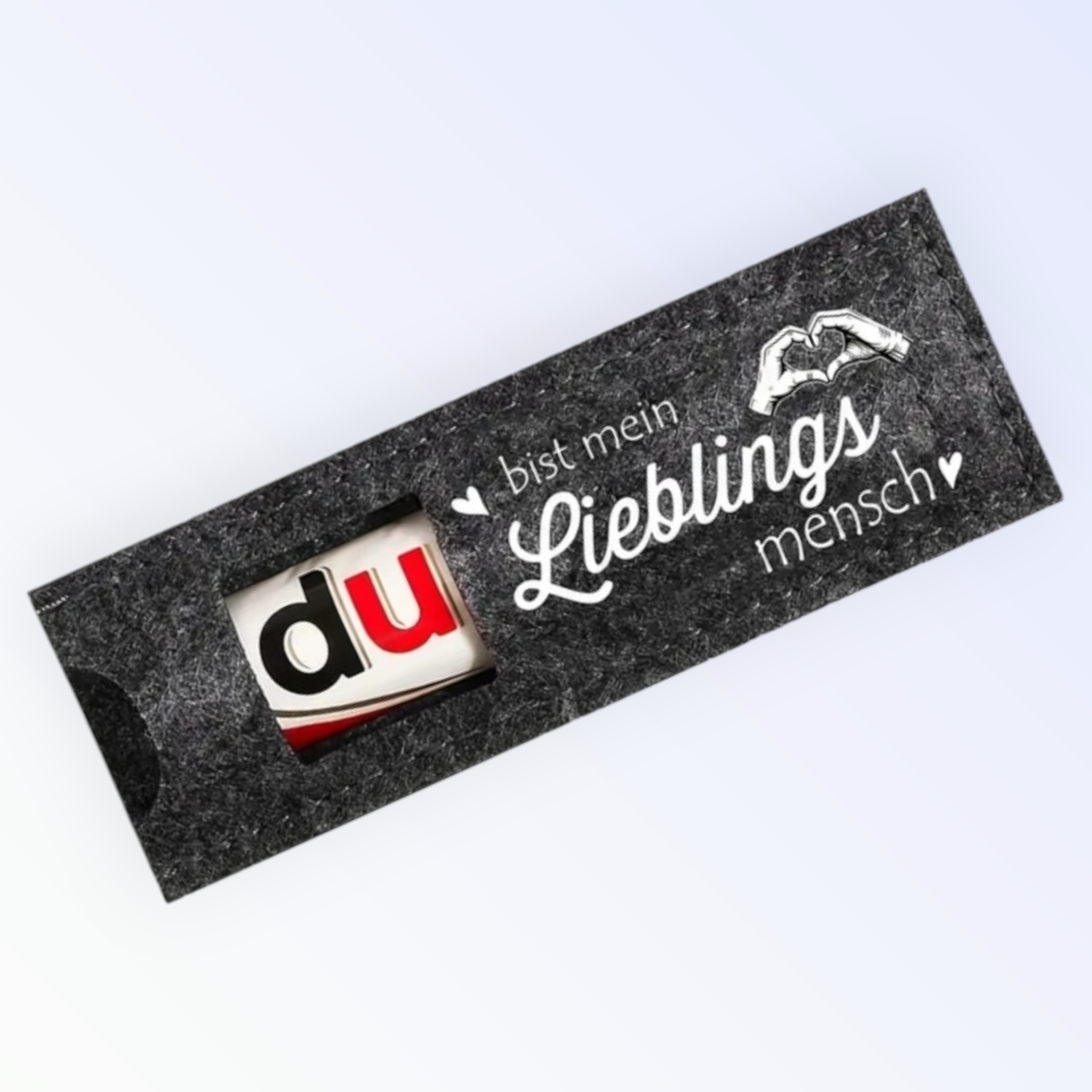 Möchtest du deinem Liebsten eine kleine Botschaft hinterlassen, dann verpacke einen Schokoriegel mit einer Filztasche mit der Aufschrift "Du bist mein Lieblingsmensch"